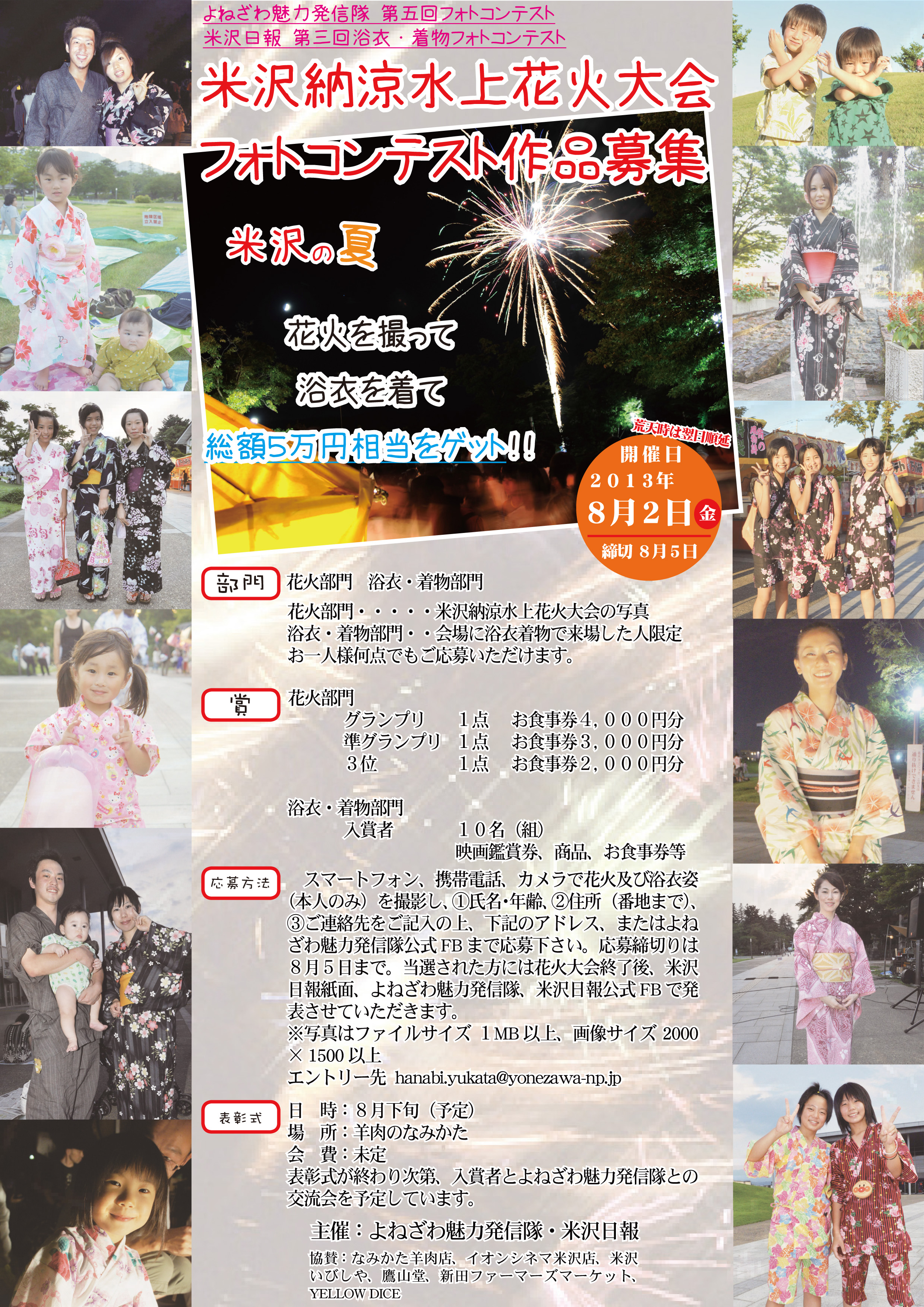 応募方法 スマートフォン、携帯電話、カメラで花火及び浴衣姿(本人のみ)を撮影し、①氏名・年齢、②住所(番地まで)、③ご連絡先をご記入の上、下記のアドレス、またはよねざわ魅力発信隊公式FBまで応募下さい。応募締切りは8月5日まで。当選された方には花火大会終了後、米沢日報紙面、よねざわ魅力発信隊、米沢日報公式FBで発表させていただきます。 ※写真はファイルサイズ 1MB以上、画像サイズ 2000×1500以上 エントリー先