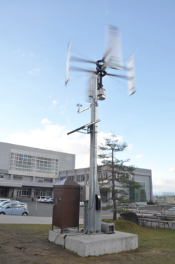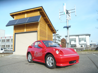 自然エネルギーによる充電については、太陽光発電と風力発電の2つを兼ね揃え、蓄電装置に電力を貯めることで、EVの安定した充電が可能。風力発電は定格発電1200W(風速12m)で2年前のプロジェクト初期の頃に製作・完成した。太陽光パネルは可変式のパネル4枚を採用したことにより、四季の太陽高度に応じて角度の調整が可能となったほか、積雪などにも強いという。