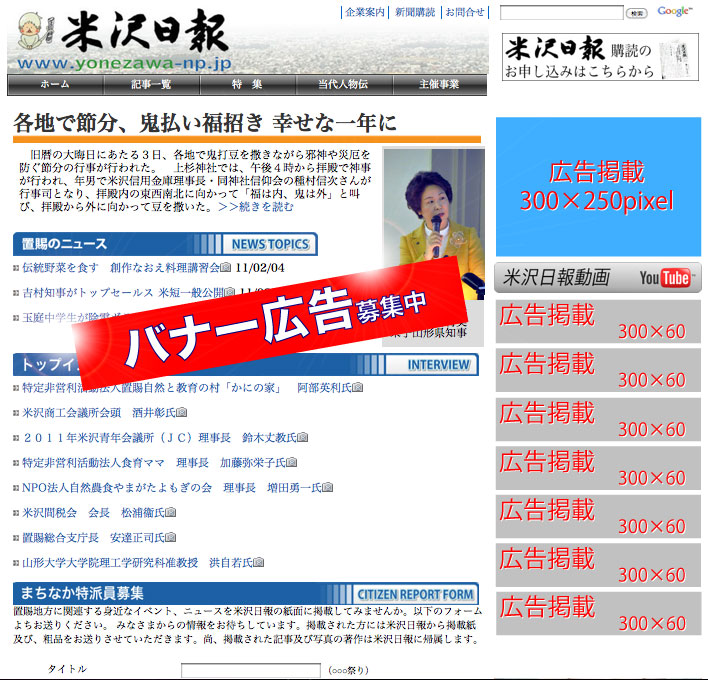 広告掲載基準 | ※広告の掲載につきましては、米沢日報の広告掲載基準に準じます。 ※お客様とのトラブルにつきましては、一切の責任を負いかねます。 |